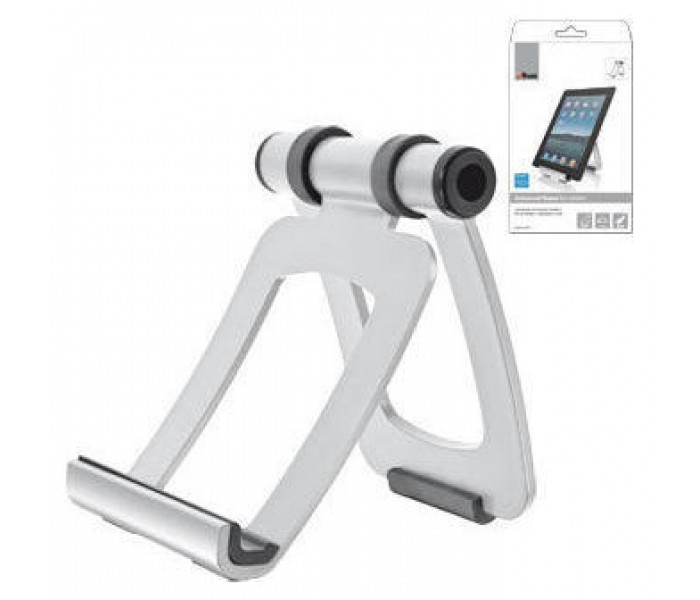 Soporte universal para tableta para disfrutar de una cómoda posición de visualización; se puede utilizar con casi cualquier tipo de tableta. Al plegarse, queda completamente plano, con lo cual puede transportarse fácilmente en cualquier bolsa. Ángulo de visualización ajustable. Posición vertical u horizontal.