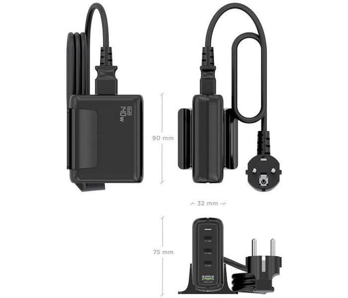 - Cargador de sobremesa GaN USB-C PD3.1 de 140W. Carga rápidamente portátiles, móviles, tablets, cámaras u otros dispositivos. Su diseño de sobremesa ofrece un acceso cómodo y rápido a los puertos USB.