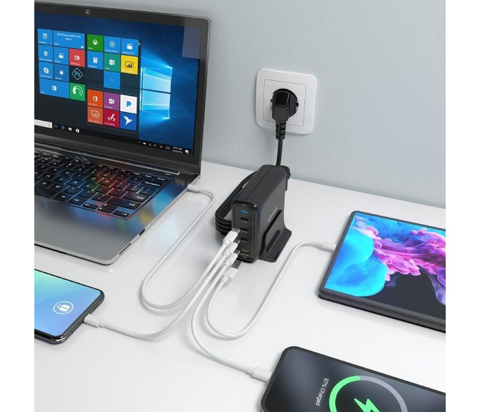 - Este cargador puede cargar simultáneamente 4 dispositivos USB-A y USB-C a máxima velocidad.