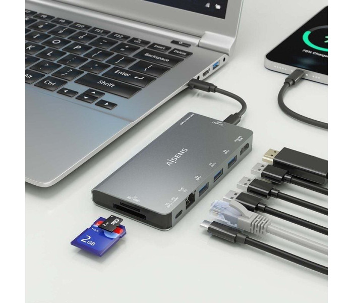 - Conversor USB-C a 1xHDMI, 1xRJ45, 3xUSB-A, 1xUSB-C DATOS+PD 100W, 1xLector de tarjeta SD, 1xLector de tarjeta MICRO SD