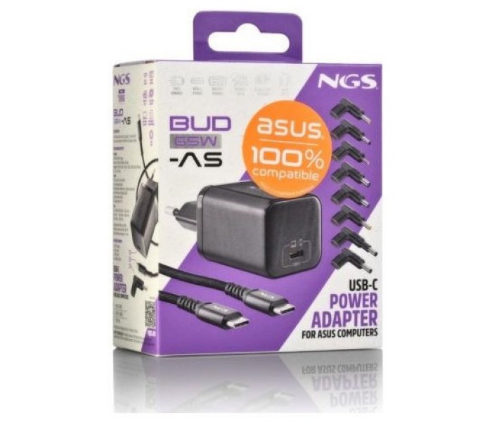 - Ideal para la oficina, el hogar o los viajes, el NGS BUD 65W-AS te ofrece potencia, fiabilidad y protección en cualquier lugar, sin necesidad de llevar múltiples cargadores.
