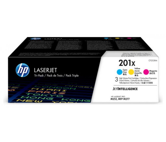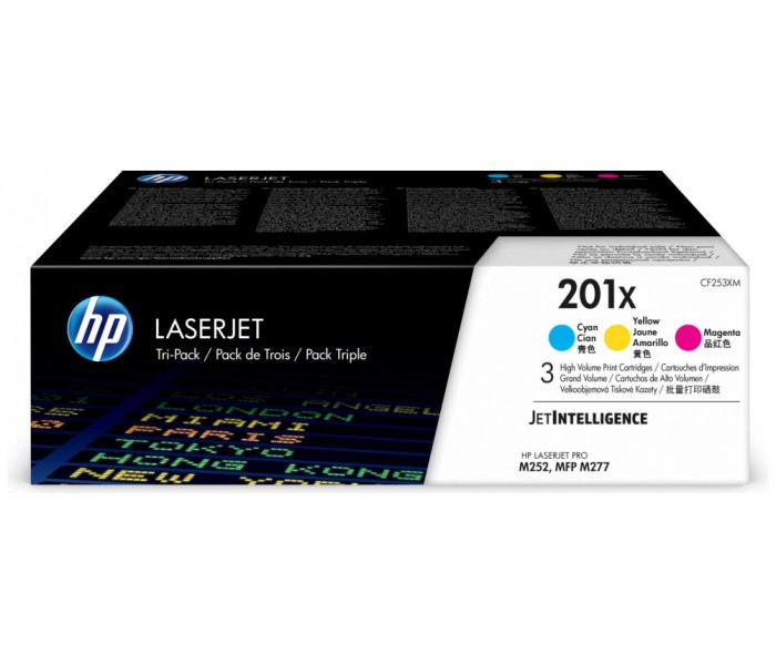 descripción del producto hp 201x - paquete de 3 - alto rendimiento - amarillo - cián - magenta - original - laserjet - cartucho de tóner (cf253xm)