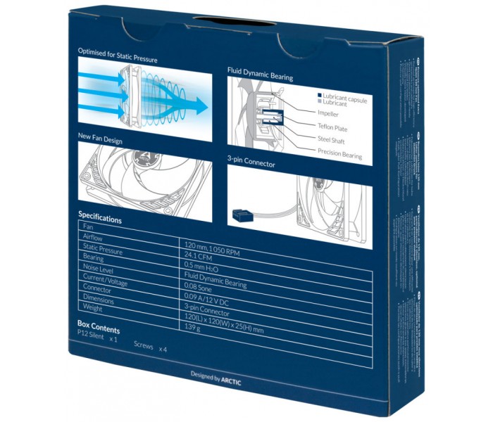 General:. Performance. Fan Speed:. 1050 rpm. Airflow:. 24.1 cfm | 41 m³/h. Static Pressure:. 0.50 mmH2O. Noise Level:. 0.08 Sone. Operating Ambient Temperature:. 0—40 ºC. . Fan:. Fan Frame:. Standard. Control Type:. Fixed Speed. Connector:. 3-Pin Connector. Fan Bearing:. Fluid Dynamic Bearing. . Electric Characteristics:. Typical Voltage:. 12 V DC. Starting Voltage:. 4.8 V. Current | Voltage:. 0.09 A | 12 V DC. Cable Length:. 400 mm. . Size & Weight. Length:. 120 mm. Width:. 120 mm. Height:. 25 mm. Weight:. 139 g