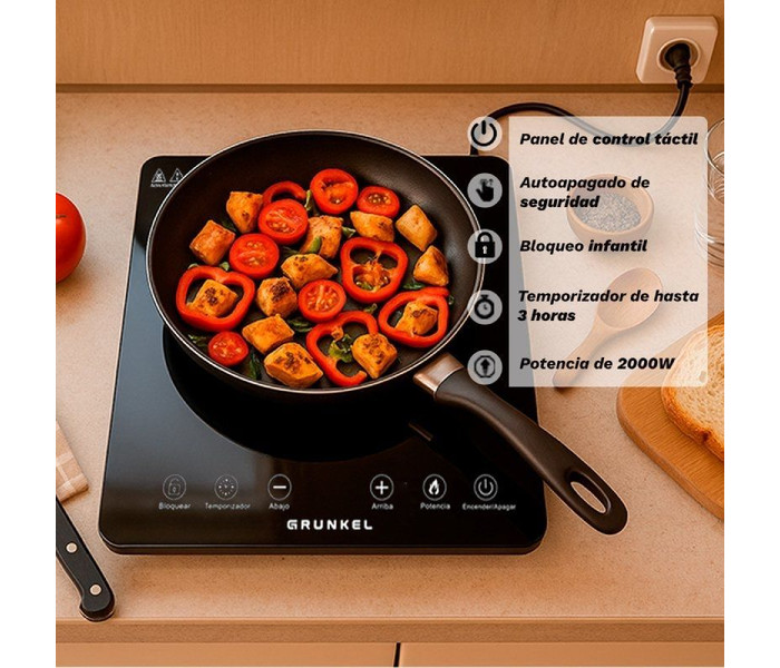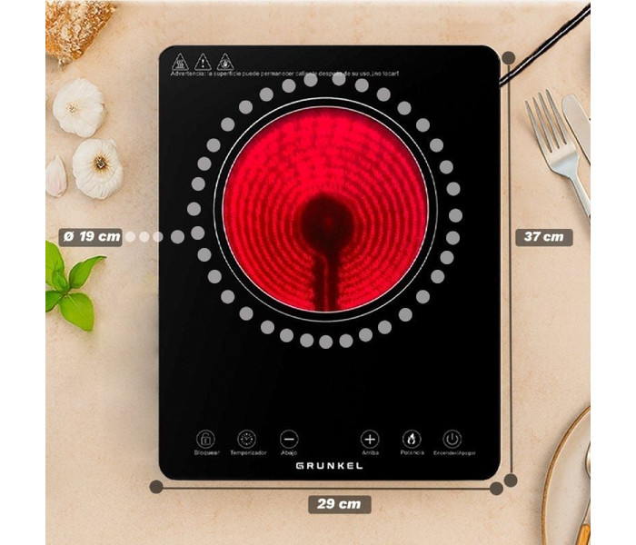 La placa de cocción por infrarrojos GRUNKEL IFR-2000 es una opción moderna, potente y segura para cocinar en cualquier lugar. Su tecnología por infrarrojos calienta de forma directa y uniforme, sin necesidad de utensilios especiales, lo que la hace compatible con todo tipo de ollas y sartenes. Con una potencia de hasta 2000W y 8 niveles ajustables, ofrece un control preciso para diferentes recetas, desde cocción lenta hasta hervidos rápidos. Su superficie de cristal negro de 29×37 cm con marco plateado aporta elegancia y resistencia. Incluye control táctil intuitivo, temporizador programable de hasta 3 horas y bobina calentadora de alta calidad para una mayor durabilidad. Además, incluye bloqueo de seguridad infantil para una mayor tranquilidad en el hogar. Ideal para cocinas pequeñas, apartamentos, segundas residencias o como complemento portátil. Gracias a su tamaño compacto y fácil manejo, es perfecta para quienes buscan versatilidad, eficiencia y estilo en una placa eléctrica moderna.Especificaciones