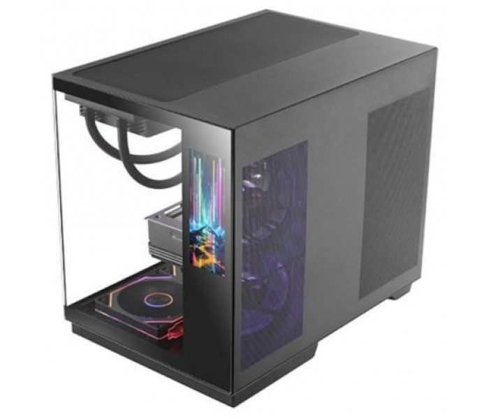 El frontal y el lateral en cristal templado continuo ofrecen una visión clara y envolvente del interior. Este diseño panorámico resalta cada componente y amplifica los efectos de iluminación ARGB, creando un espectáculo visual que une elegancia, creatividad y personalidad.