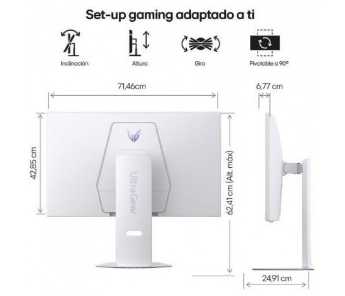 - Diseño blanco minimalista, base compacta y soporte ajustable en altura, giro, pivote e inclinación.