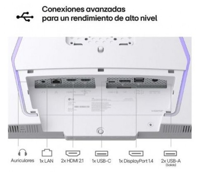 - Conectividad: 2x HDMI, 1x DisplayPort 1.4, 1x USB-C (3840x2160 a 144 Hz, datos, energía 65 W), salida de auriculares 3,5 mm (3 polos), LAN RJ-45, 2x USB descendentes (2.0), 1x USB ascendente (Thunderbolt)
