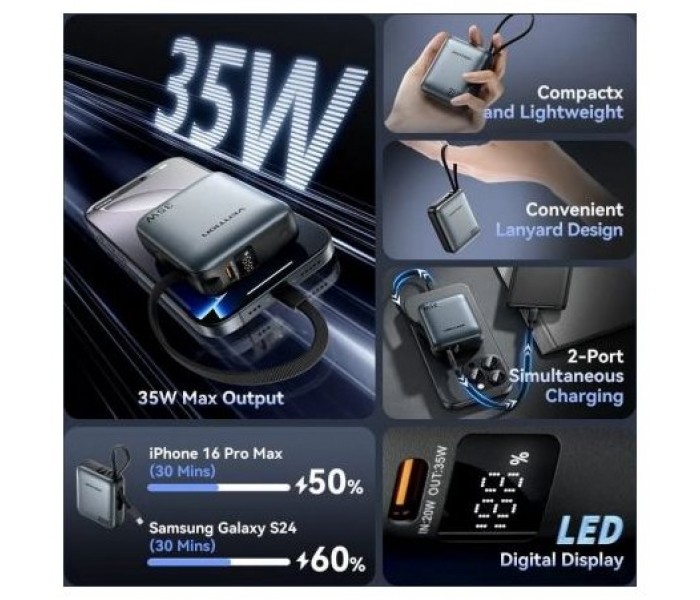 El cable USB-C incorporado y el puerto USB-C admiten carga rápida 35W PD y PPS, ideal para portátiles, tabletas y teléfonos.