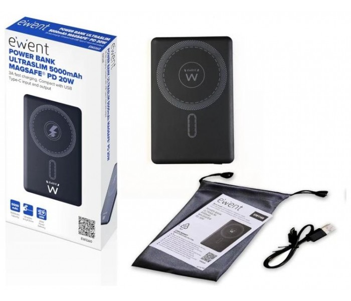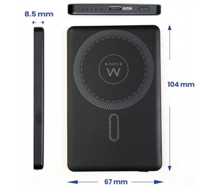 Características | - Capacidad: 5000mAh - Tipo de batería: Li-Polymer - Carga rápida: Power Delivery (PD) 22.5W / Quick Charge (QC) - Compatibilidad: Dispositivos con carga USB-C y MagSafe® - Entrada USB-C: 5V-2A, 9V-2A, 12V-1.5A (Máx. 18W) - Salida USB-C: 5V-3A, 9V-2.2A, 12V-1.67A - Carga simultánea - Indicadores LED - Protección de seguridad contra sobrecarga, sobrecalentamiento y cortocircuitos Dimensiones y peso - 104 x 67 x 8.5mm - 109g |
