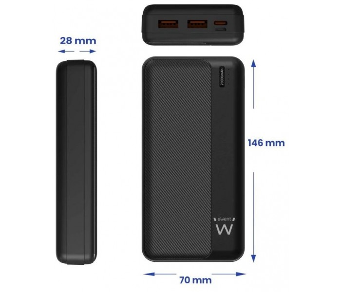 Características | - Capacidad: 20,000 mAh - Tipo de batería: Li-Polymer - Entradas de carga USB-C: 5V-2.5A; 9V-2A; 12V-1.5A Micro-USB: 5V-2A; 9V-2A; 12V-1.5A - Salidas de carga USB-C: 5V-2A; 9V-2A; 12V-1.5A USB-A1/A2: 5V-3A; 9V-2.22A; 10V-2.25A; 12V-1.67A Dimensiones y peso - 146 x 70 x 28mm - 395g |