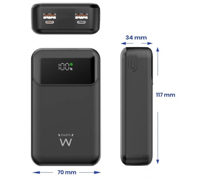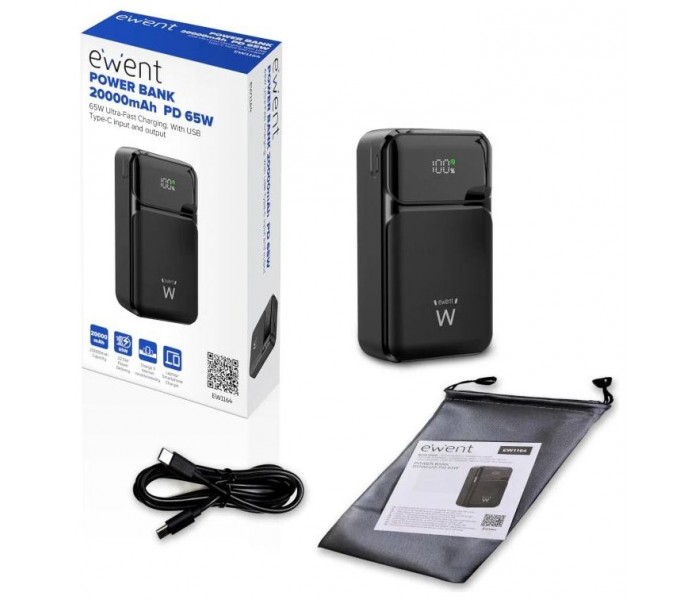 Características | - Capacidad: 20,000 mAh - Tipo de batería: Li-Polymer - Velocidad de carga - Carga rápida PD 65W - Compatible con múltiples perfiles de voltaje (5V, 9V, 12V, 15V, 20V) - Entradas Tipo-C1: 5V-3A; 9V-3A; 12V-3A; 15V-3A; 20V-3.25A (PD 65W) Tipo-C2: 5V-2A; 9V-2A; 12V-1.5A - Salidas: Tipo-C1: 5V-3A; 9V-3A; 12V-3A; 15V-3A; 20V-3.25A (PD 65W) USB-A1: 5V-4.5A / 5V-3.0A; 9V-2.0A; 12V-1.5A (Máx. 22.5W) USB-A2: 5V-4.5A / 5V-3.0A; 9V-2.0A; 12V-1.5A (Máx. 22.5W) |