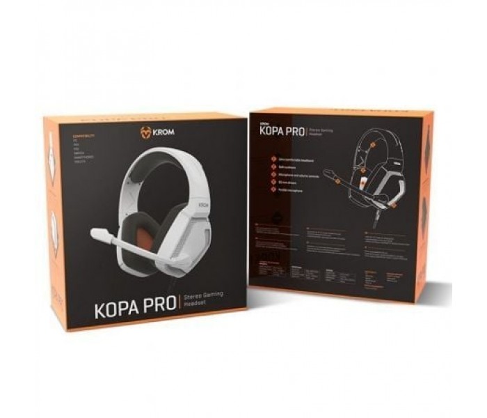 Krom Kopa PRO son la evolución de nuestros icónicos auriculares gaming Kopa. Estos auriculares estéreo cuentan con compatibilidad multiplataforma, siendo compatibles con PC, PS4, PS5, Nintendo Switch, Tablets y Smartphones. Creados con un cuidado diseño sobrio y una gran ergonomía, con estos auriculares disfrutarás de largas sesiones de juego o música en cualquier dispositivo.Hazte escuchar alto y claroEl micrófono flexible omnidireccional que incorporan los auriculares Kopa PRO, te permitirá ajustarlo a la distancia perfecta para ti, transfiriendo así tu voz de forma clara y nítida, garantizando de este modo la máxima comunicación con tu equipo y el resto de jugadores, ya que recoge tu voz con precisión.Gran confortEstos auriculares gamers te ofrecerán una gran comodidad en tus largas sesiones de juego, dado que cuentan con unas almohadillas acolchadas y ultra suaves en las orejeras y la diadema, que han sido diseñadas en materiales de excelente calidad con un tacto suave y agradable.Úsalos durante horas sin notar que los tienes puestos gracias a su diadema ajustable de peso ultraligero. Kopa PRO ha sido diseñado para no apretar, pensando también en aquellos gamers que también usan gafas.Excelente calidad de sonidoAíslate del exterior y céntrate en el juego con los Krom Kopa PRO con sus altavoces de 50 mm y su sonido estéreo de gran calidad disfruta de sesiones de juego y música sin interrupciones, sí, incluso en los ambientes más ruidosos. Que tus enemigos no te pillen desprevenido gracias a su sonido envolvente.Además, podrás controlar el volumen de tus Kopa PRO con el control de volumen y micrófono que incorpora en el auricular izquierdo, obteniendo así más libertad y control en cada momento.
