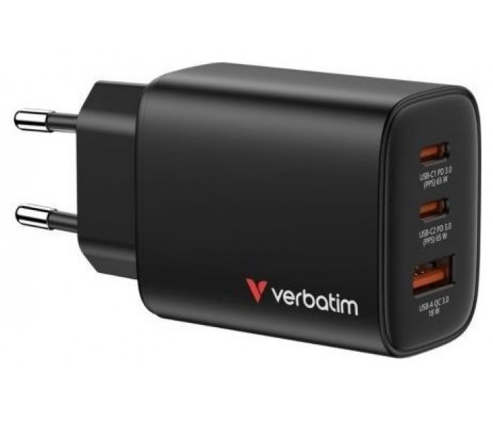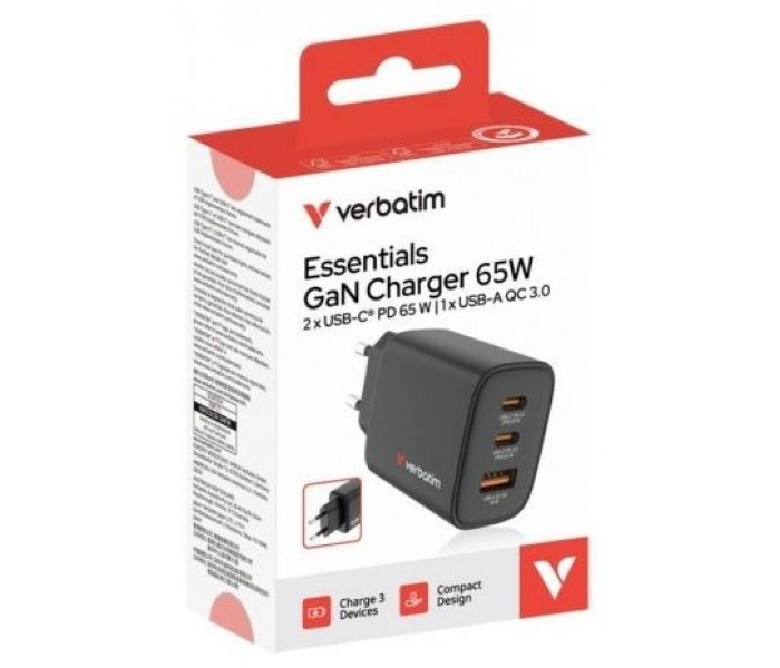Cargador de Pared GaN Verbatim Essentials/ 2xUSB Tipo-C/ 1xUSB/ 65WCargador de pared Essentials GaNE..