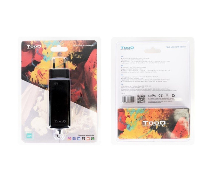 Fabricado con la tecnología Gan (Nitruro de Galio), que permite un suministro de corriente más eficiente disminuyendo las altas temperaturas que soportan los dispositivos.. Entrada: . 110-240V 50/60Hz 1.2A max.. Salidas:. USB-C: DC5V/3A, DC9V/3A, DC12V/3A, DC15V/3A y DC20V/2.25A. Potencia:. 45W. Válido para todo tipo de dispositivos con conector USB-C de carga. Compatible con MAC. Cable de 1.8 metros. Certificación: . CE, FCC y RoHS. Color:. Negro