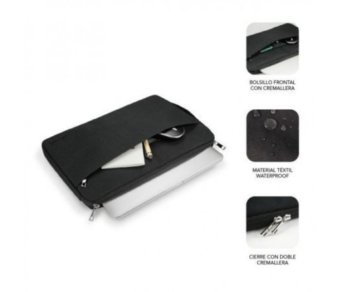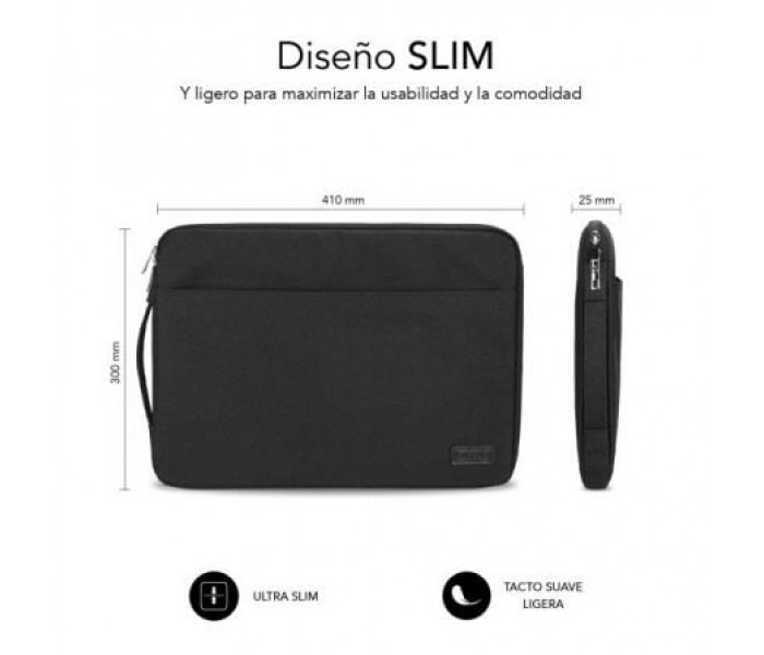 Especificaciones:. . • Funda para ordenadores de hasta 15,6″. • Ideal para el transporte diario de tu dispositivo. • Bolsillo con cremallera frontal y compartimentos interiores para el transporte de accesorios. • Cierre con doble cremallera para una protección total. • Exterior de la funda fabricada con tela de poliéster 600D a prueba de líquidos y otros elementos. • Interior acolchado con relleno de Foam de doble capa. • Asa de mano lateral retráctil. • Compacta e ideal que ofrece un cómodo acceso a tu ordenador. • Apariencia liviana y delgada a la vez que elegante.