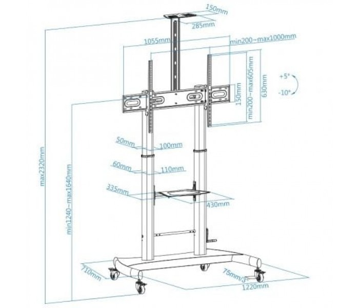 TOOQ SOPORTE DE SUELO CON RUEDAS CON REGULACIÓN DE ALTURA PARA PANTALLAS 60"-100", PES. MAX. 100 KG, VESA: MAX 1000x600 MIN 400x400 INCLINACIÓN: +5°/-10° (FS20404HM-B)